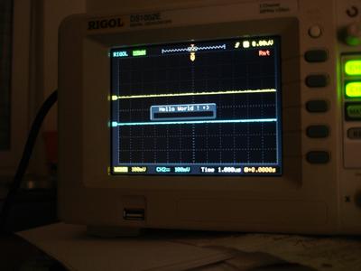 I'm proud to present you my first "Hello World" application on the Rigol DS1052E! So far as i know, it's the very first homebrew software on a rigol oscilloscope :)